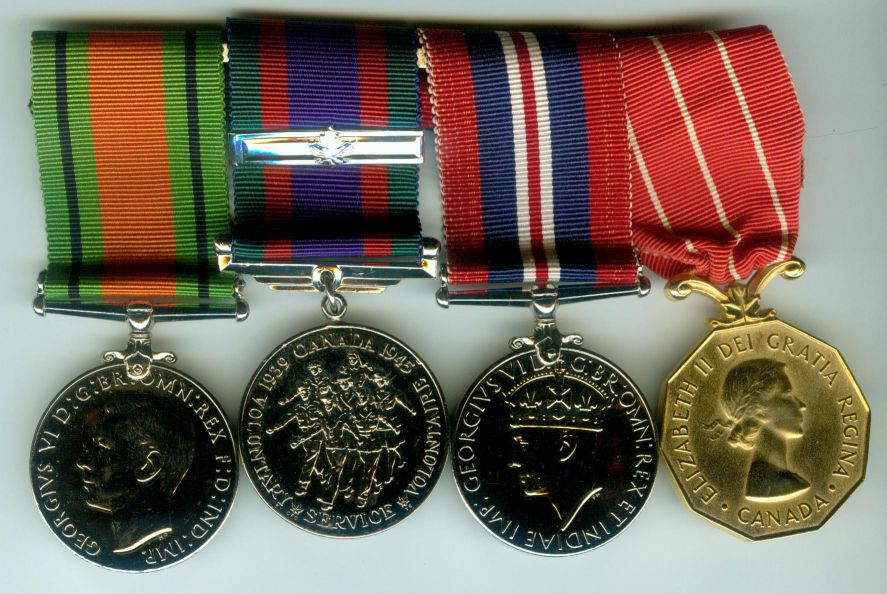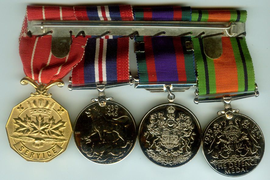 From Left to Right - British Defense Medal, Canadian Voluntary Service Medal, British War Medal 1939-45, Canadian Forces Decoration Medal