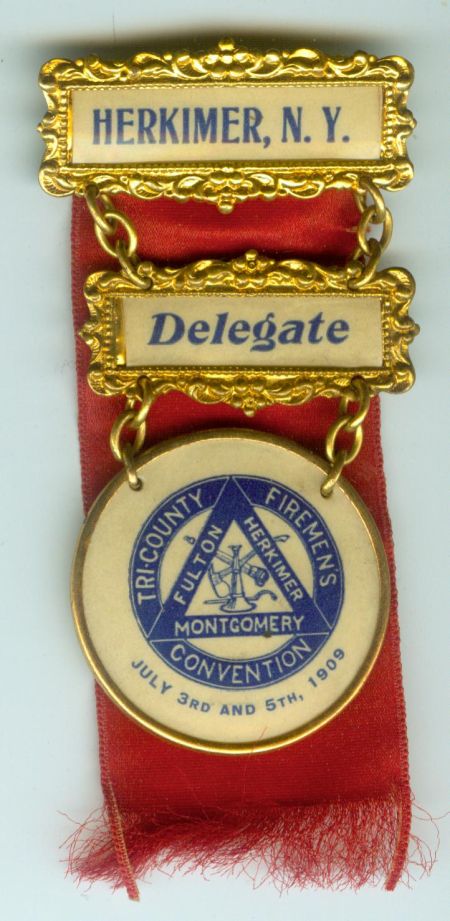 Deligate's badge for the NY Tri-County Fireman's Convention held in July 1909.