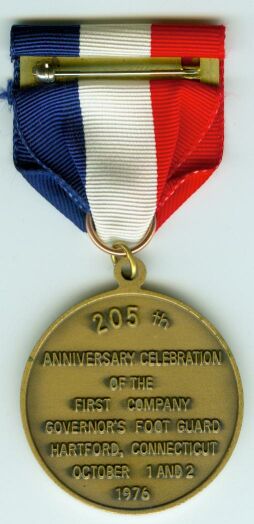 The Connecticut 1st Company, Governor's Foot Guards 205th Anniversary Medal was awarded to members of the Connecticut 1st Foot Guard to commemorate their 205th anniversary in 1976.